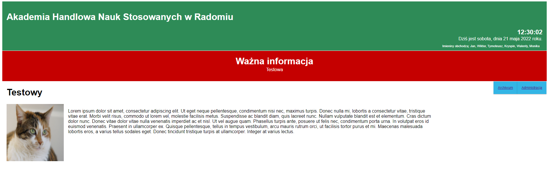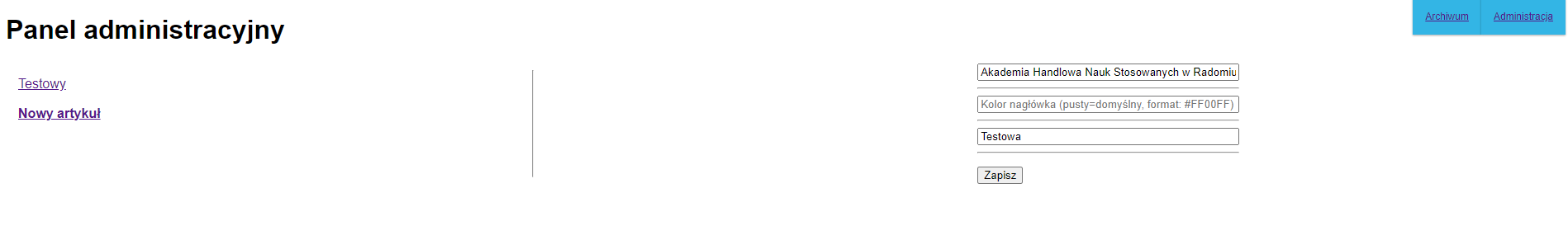 Administrator ma możliwość stworzenia nowego artykułu (z opcjonalną, dodatkową grafiką), edycji, bądź usunięcia już istniejącego artykułu, zmiany nazwy uczelni, koloru górnej belki, bądź też dodania dodatkowego komunikatu, wyświetlającego się w dodatkowej, czerwonej belce.